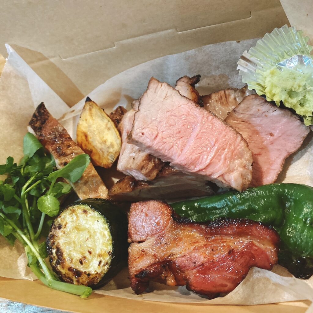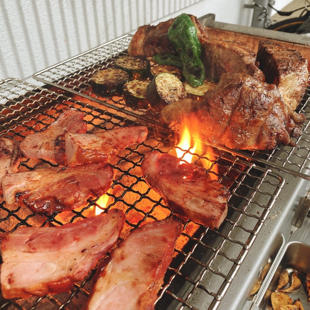 ②TEA豚炭火焼きBBQ盛り~肩ロース岩塩焼き、ロースタレ焼き、ベーコンに夏野菜で@2,200(写真⬆の