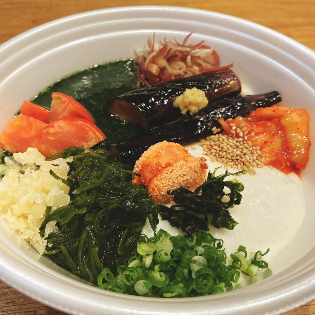大和芋にめかぶ、モロヘイヤを叩いて、香りのみょうがに地のり、揚げなすにゴマ風味のキムチ&辛子明太子にフルーツトマトの酸味とともに。