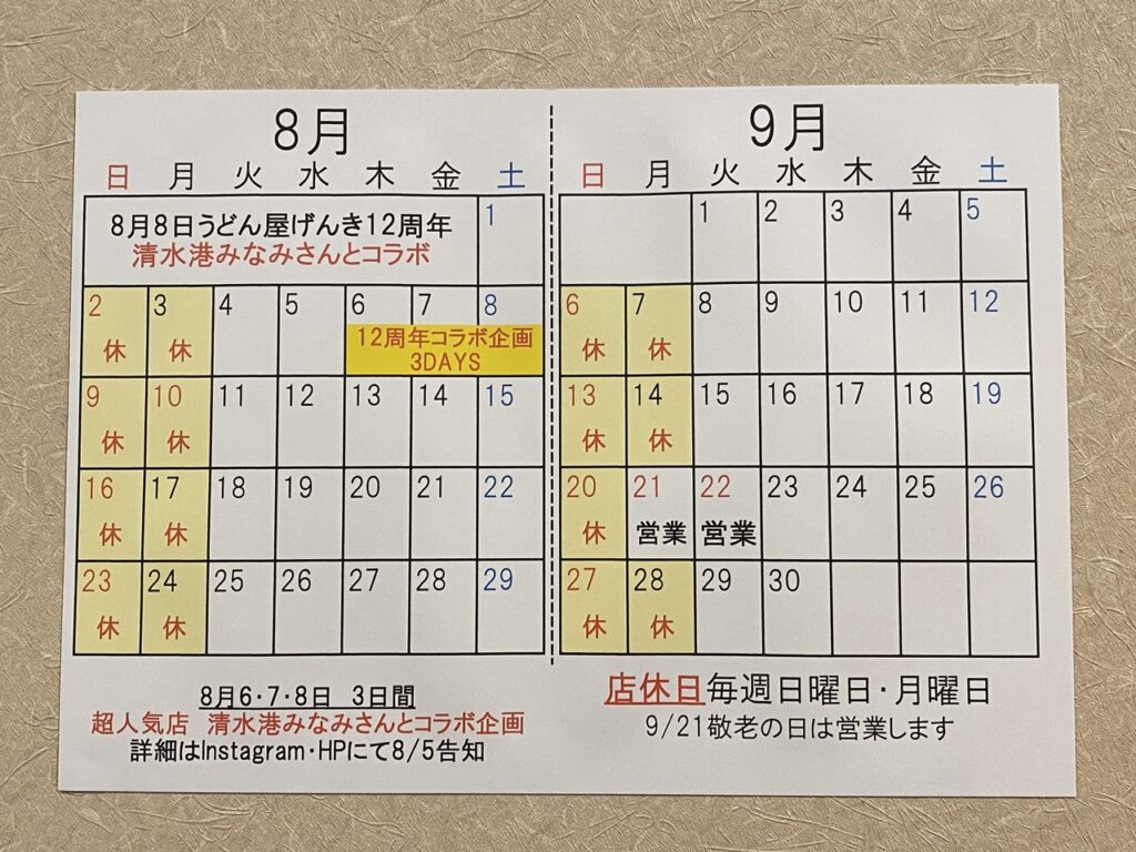 8月より定休日が日曜日、月曜日になりました。