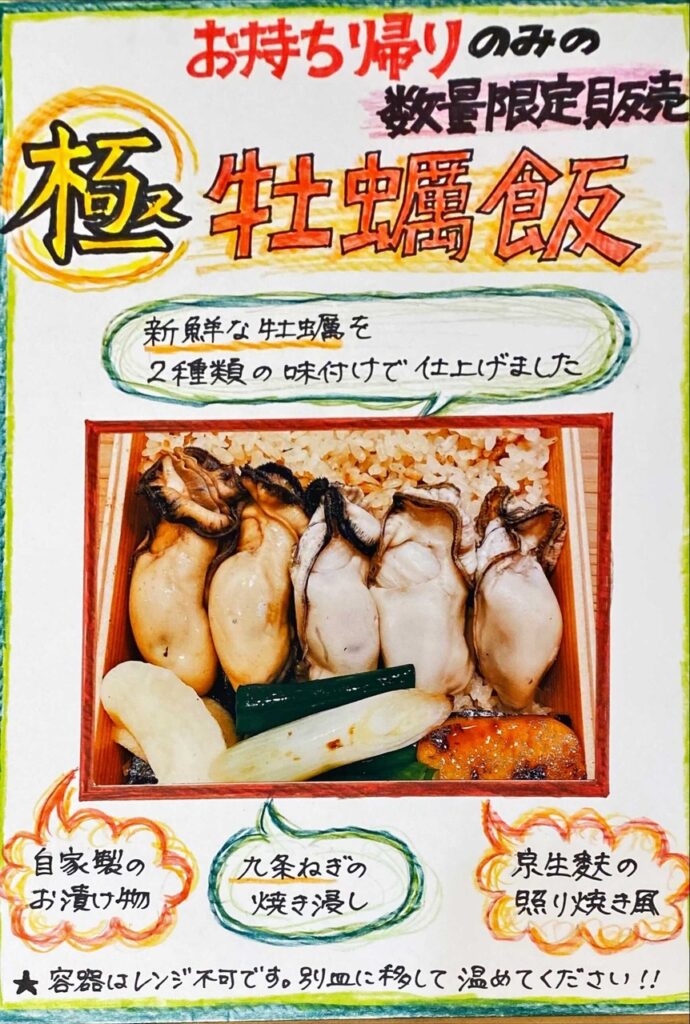 大人気につき、蔓延防止も延長の為、極み牡蠣めし販売延長します。 極み牡蠣めし\1,500(税込)毎日限定18個 5個以上のご注文は事前予約が確実です。 -