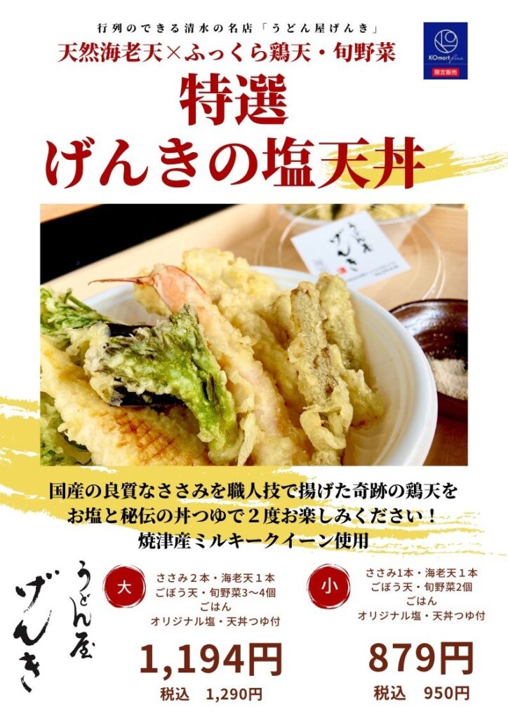コロナ禍でお家時間を楽しく美味しく味わって頂きたく、KOmart fine様からのご要望もあり、5月より毎週水曜日はげんきの天丼が販売されます。KOmartfine池田店、草薙店、沓谷店は5月5日より販売開始 良質な油と旬の食材を使用しているので、天然のお塩で味...