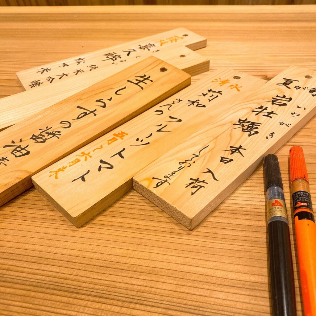 檜板〜おしながきメニュー店主が創業5年目位から始めた、檜板に筆にて書くこと。お料理は全て手作りにて作っていることから、メニューも手書きにてとお客様に勧められたのがきっかけです。 -