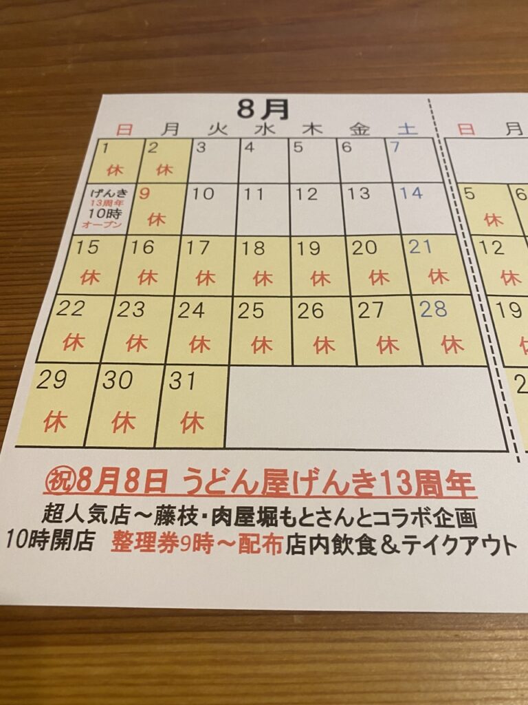 8月よりランチ営業が11時〜15時(ラストオーダー14時30)まで延長になります。 8月8日はうどん屋げんき13周年日曜日ですが特別営業致します。☆臨時休業のお知らせ☆8月15日〜9月2日まで夏休み頂きます。 -