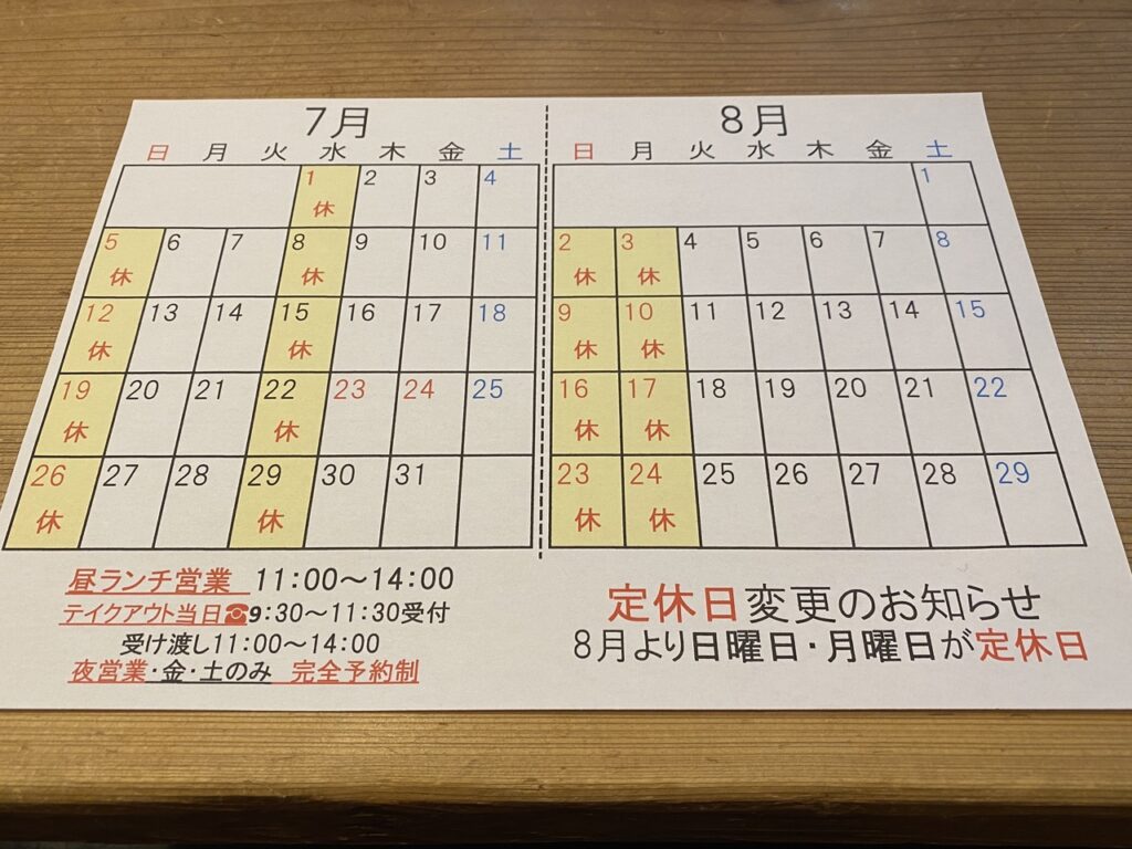 7月の定休日は日曜日と水曜日お昼ランチ11時~14時夜営業は金曜日と土曜日のみで完全予約制になります。8月からは定休日が変更になります。8月の定休日は日曜日と月曜日。テイクアウトも混雑を防ぐ為に継続中。 -